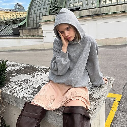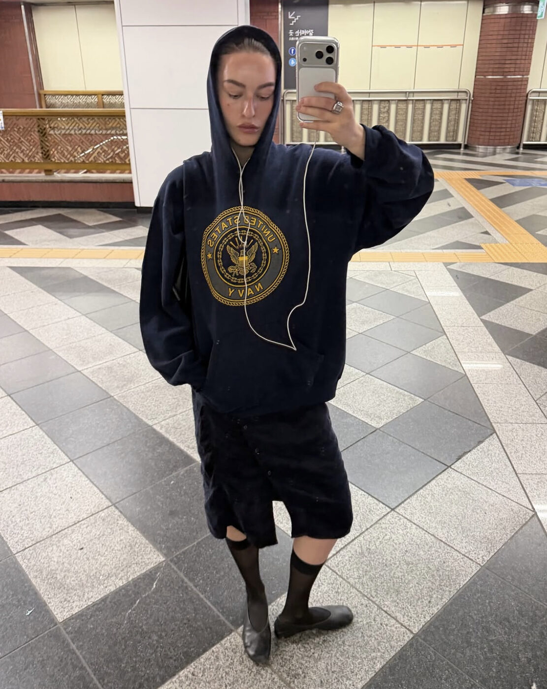 집에 돌아다니는 흔한 그래픽 후드도 각 잡고 입으면 충분히 훌륭하게 스타일링이 가능합니다. 하의의 길이감만 신경써주면 되는데요. 무릎 위까지 오는 버뮤다 팬츠나 슬릿이 깊게 들어간 치마를 매치해 조금은 답답해 보일 수 있는 후드의 무게감을 덜어내는 거죠. 여기에 무릎까지 올라오는 시스루 양말을 더하면 톰보이적인 무드와 남들과는 다른 한 끗을 드러낼 수 있고요. 만약 전체적인 룩이 너무 보이시해지는 것이 꺼려진다면, 시나 안줄리처럼 굽 없는 담백한 플랫 슈즈로 마무리해 보세요.