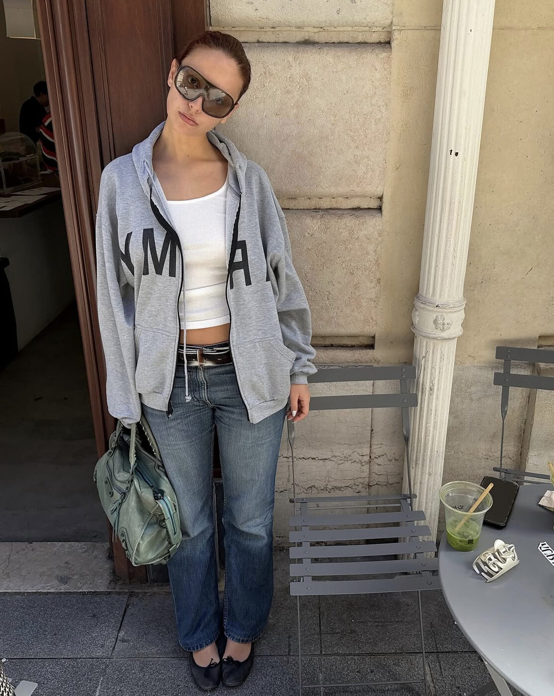 가장 기본인 회색 후디 집업을 세상 쿨하게 입는 법입니다. 지퍼를 다 열어 흰색 민소매 이너를 드러냈는데, 포인트는 하의와 신발이에요. 스트레이트 핏 데님 아래에 아주 귀엽고 앙증 맞은 블랙 플랫 슈즈를 신었거든요. 상체는 넉넉하고 편안해 보이지만 발끝에서 여성스러운 맛을 살려준 게 이 룩의 킥이죠. 여기에 톤 다운된 민트색 모터백을 무심하게 들어 색감의 빈티지한 재미까지 챙겼고요.