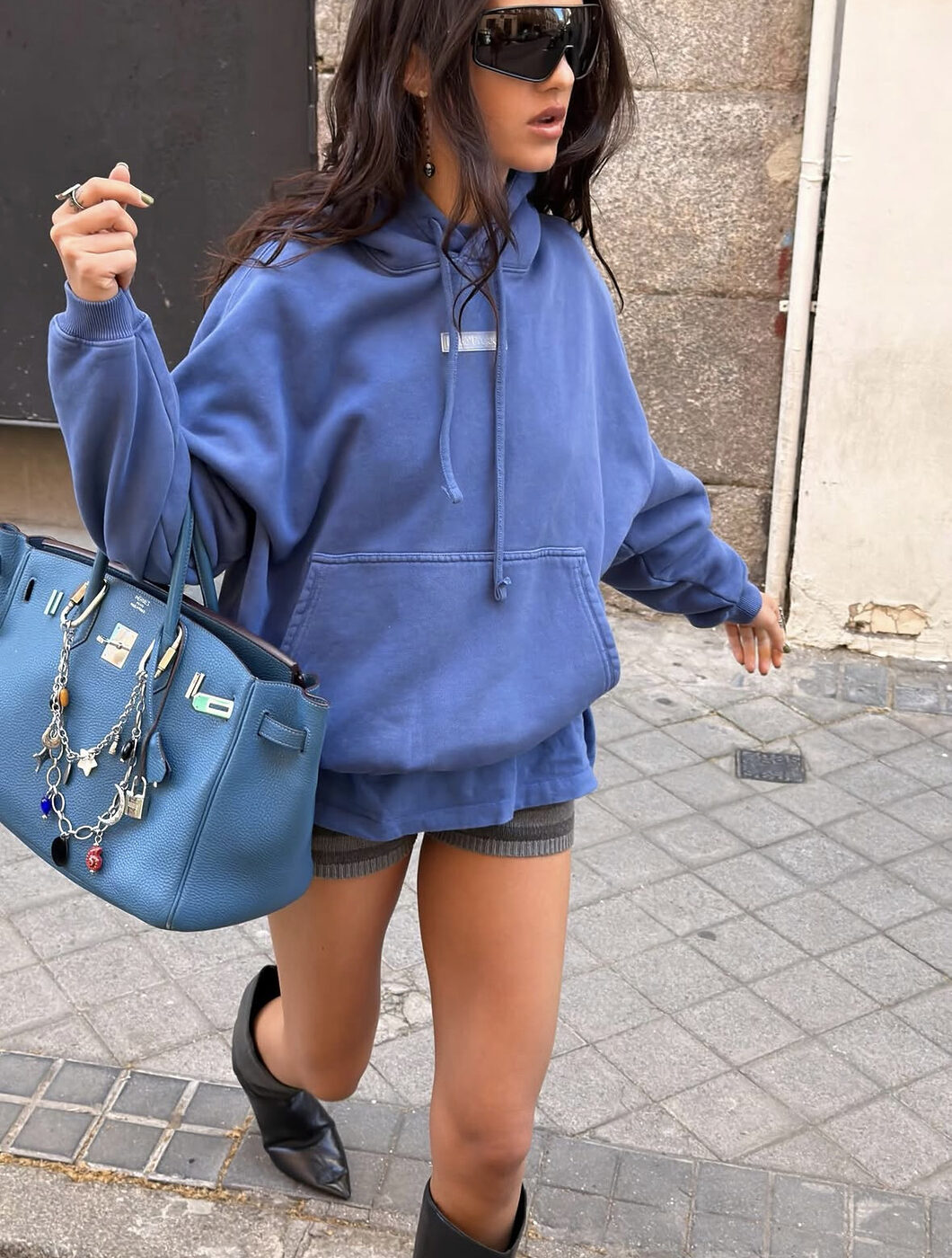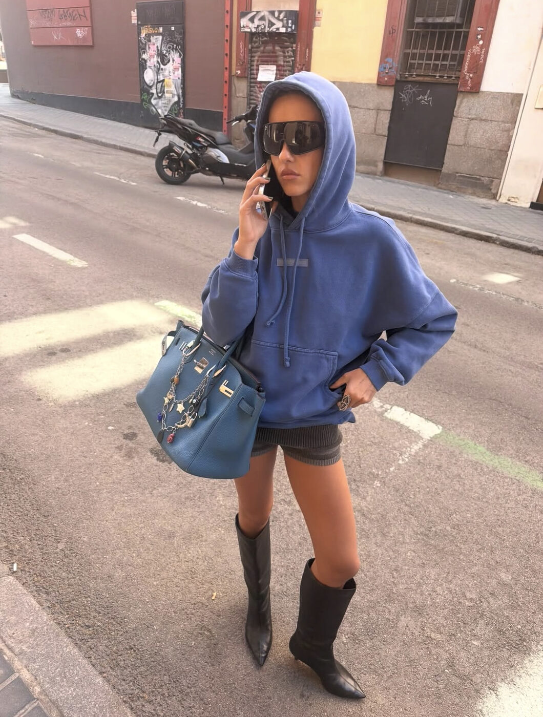 낮엔 덥고 밤엔 쌀쌀한 요즘 같은 날씨에 도톰한 후디와 쇼츠의 조합은 그야말로 빛을 발합니다. 파란 후디 모자를 푹 눌러쓰고, 아래로는 보들보들한 니트 쇼츠를 매치해 소재의 재미를 줬네요. 여기에 잔뜩 구겨진 듯한 머리 모양이 쿨한 무드를 더해주죠. 너무 가벼워 보이지 않도록 무릎 아래까지 오는 웨스턴 스타일의 부츠를 신어 무게감을 잡은 것도 포인트! 보드라운 백에 주렁주렁 매단 귀여운 체인들로 발랄함까지 챙겼어요.