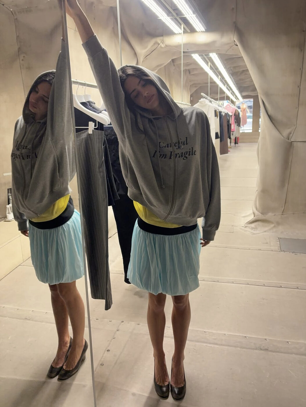 러블리한 무드, 후디하고도 당연히 조합이 가능합니다. 캐주얼한 룩을 즐기는 사람만이 후디를 활용하지 않는다는 얘기죠. 회색 후디를 끝까지 잠가 올리고 그 아래로 풍성한 하늘색 벌룬 스커트를 입었는데요. 공주님처럼 유치하거나 과해 보일 수 있는 치마지만, 여유로운 실루엣의 후디가 그 힘을 쭉 빼주면서 언제나 입어도 이상하지 않은 룩이 됐죠. 사랑스러운 아이템들도 후디 하나면 스타일링이 어렵지 않다는 것, 이게 바로 지금 안목 있는 여성들이 후디를 즐기는 방식입니다.