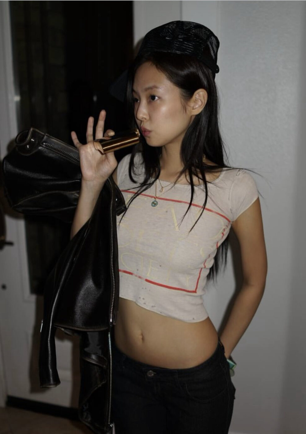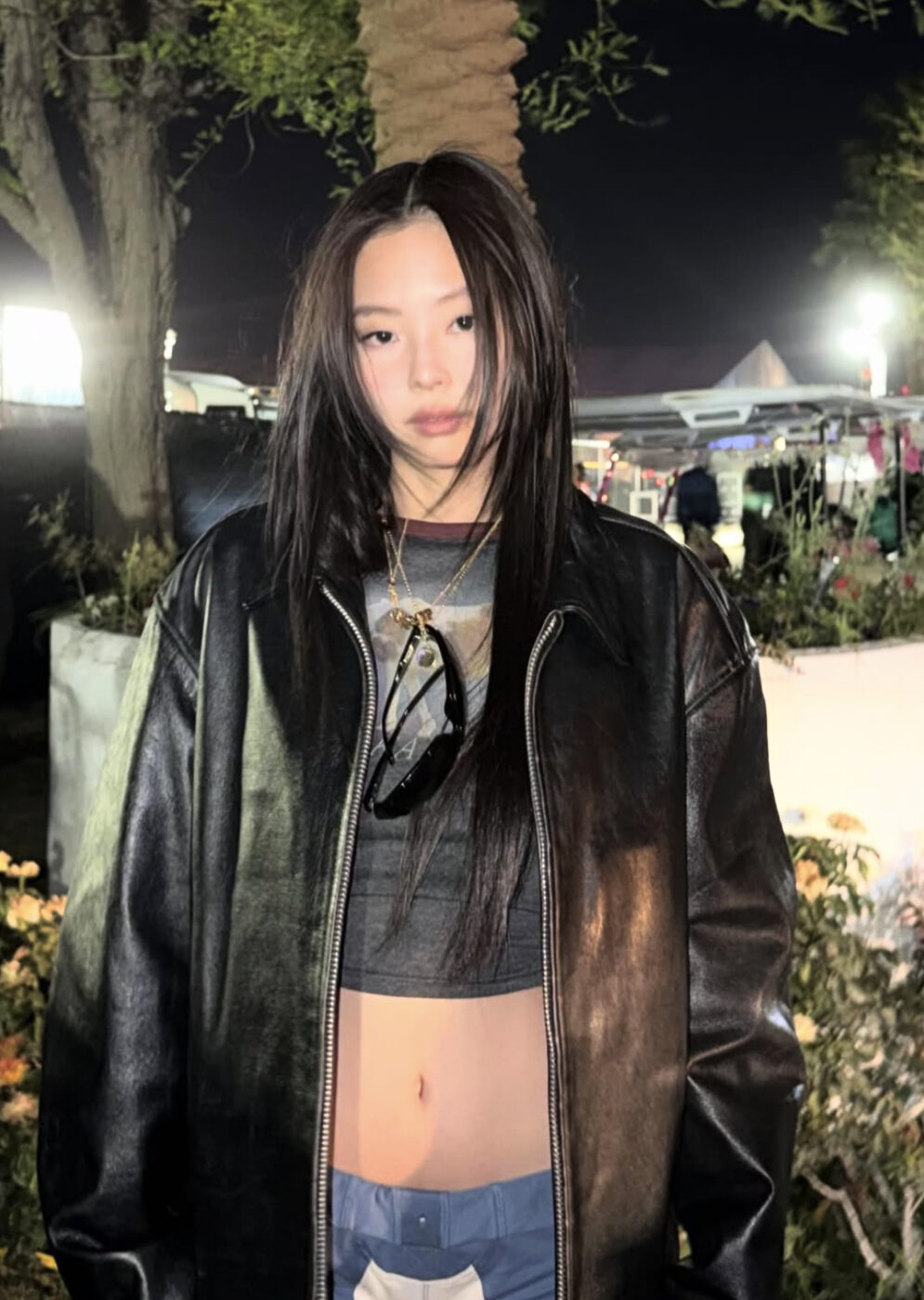 제니는 캐주얼하고 시크한 크롭 티셔츠로 허리를 드러냈습니다. 페스티벌 혹은 일상에서 입어도 좋을 크롭 톱에 로우 라이즈 진으로 허리의 곡선을 더욱 강조했죠. 쿨하고 세련된 옷차림 위엔 매니시하고 터프한 레더 재킷으로 에지를 더했어요.