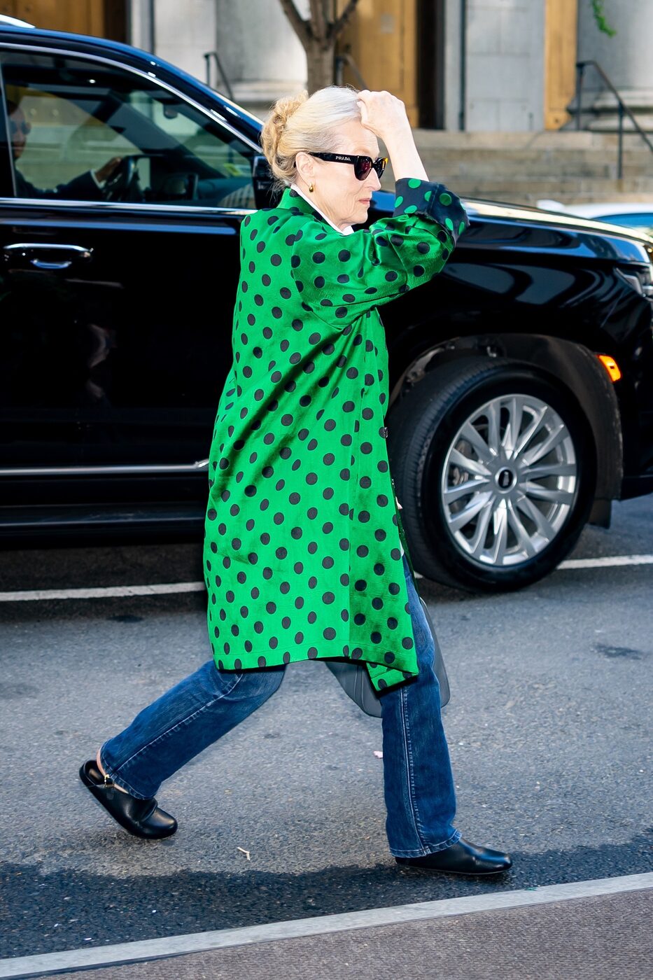 프레스 이벤트에서는 도트 패턴의 초록색 로브 코트로 시선을 빼앗았는데요. 주목할 점은 코트는 실크 소재로 드레시한 아이템이지만 여기에 데님 팬츠와 캐주얼한 뮬을 더해 조화로운 밸런스를 맞췄습니다. 덕분에 화려한 로브 코트가 너무 과해보이지 않죠.