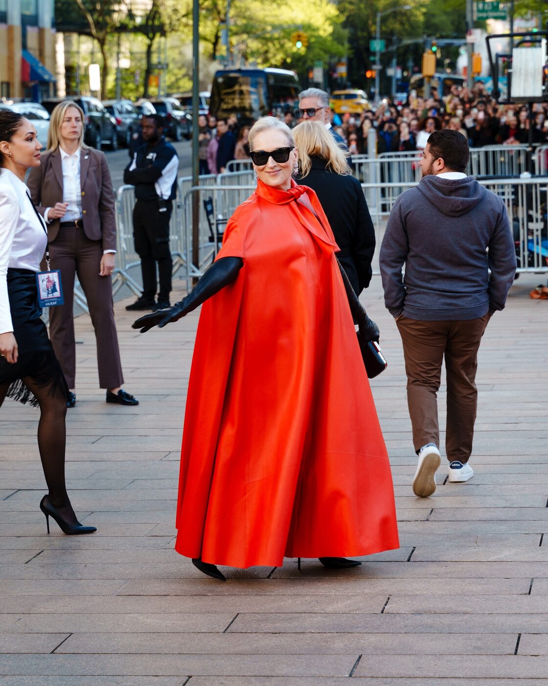 4월 20일 뉴욕에서 열린 시사회날! 메릴 스트립은 영화의 시그니처 컬러인 레드 컬러의 케이프 코트를 입고 등장했습니다. 리본 장식이 더해진 목부터 발까지 A라인으로 퍼지는 실루엣이 아티스틱한 이 코트는 지방시의 사라버튼 작품. 여기에 메릴은 블랙 선글라스와 블랙 가죽 장갑으로 블랙&레드 조합의 강렬하면서도 시크한 매치를 완성했어요.