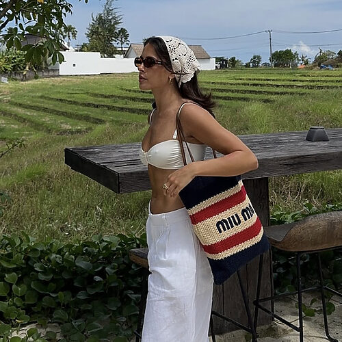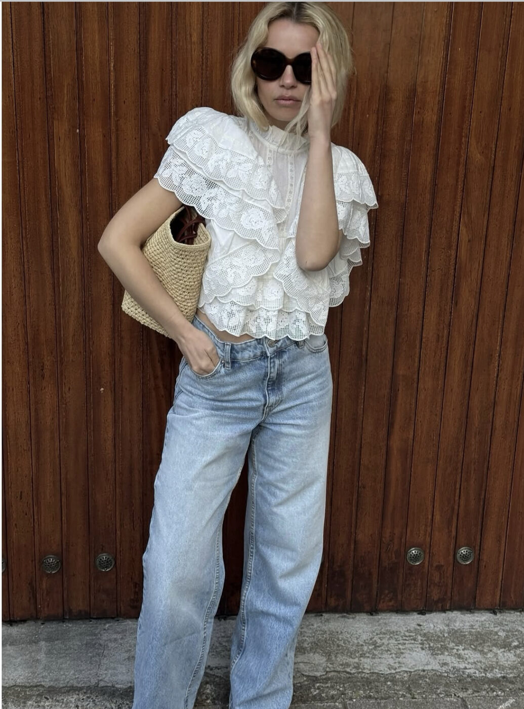 물 빠진 연한 데님 팬츠, 실루엣조차 빈티지 감성이 물씬 풍기는 보이프렌드 핏이라면 가장 쿨한 옷차림을 완성할 수 있습니다. 다소 과장되게 로맨틱한 러플 장식의 화이트 블라우스라 할지라도 말이죠. 플랫 슈즈와 내추럴한 스트로 소재 가방을 들어주면 설렘 가득한 초여름 패션이 완성되요.