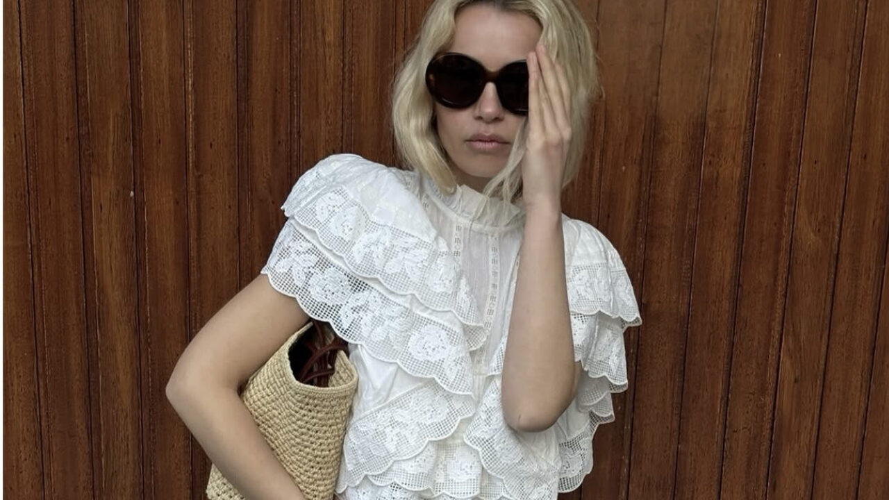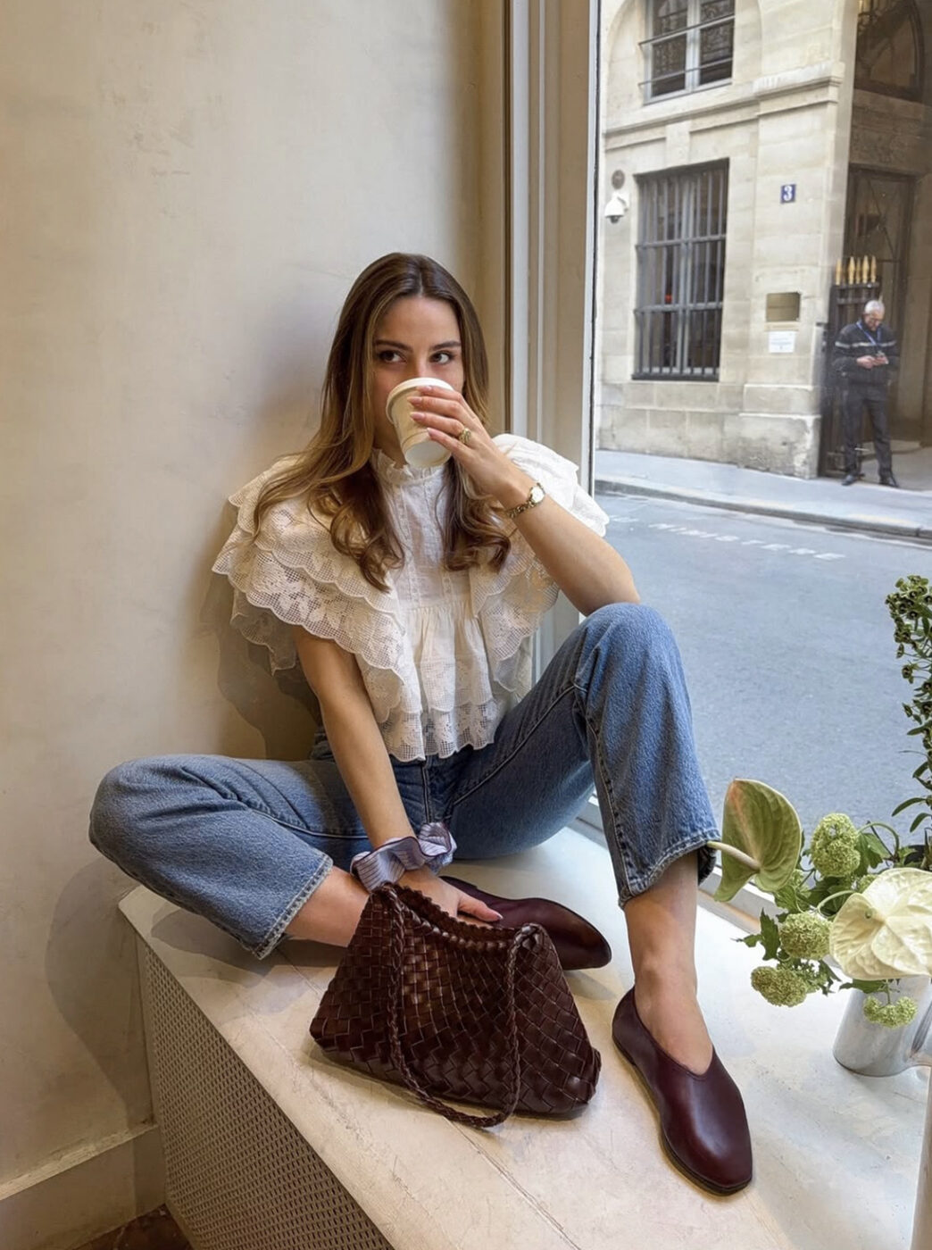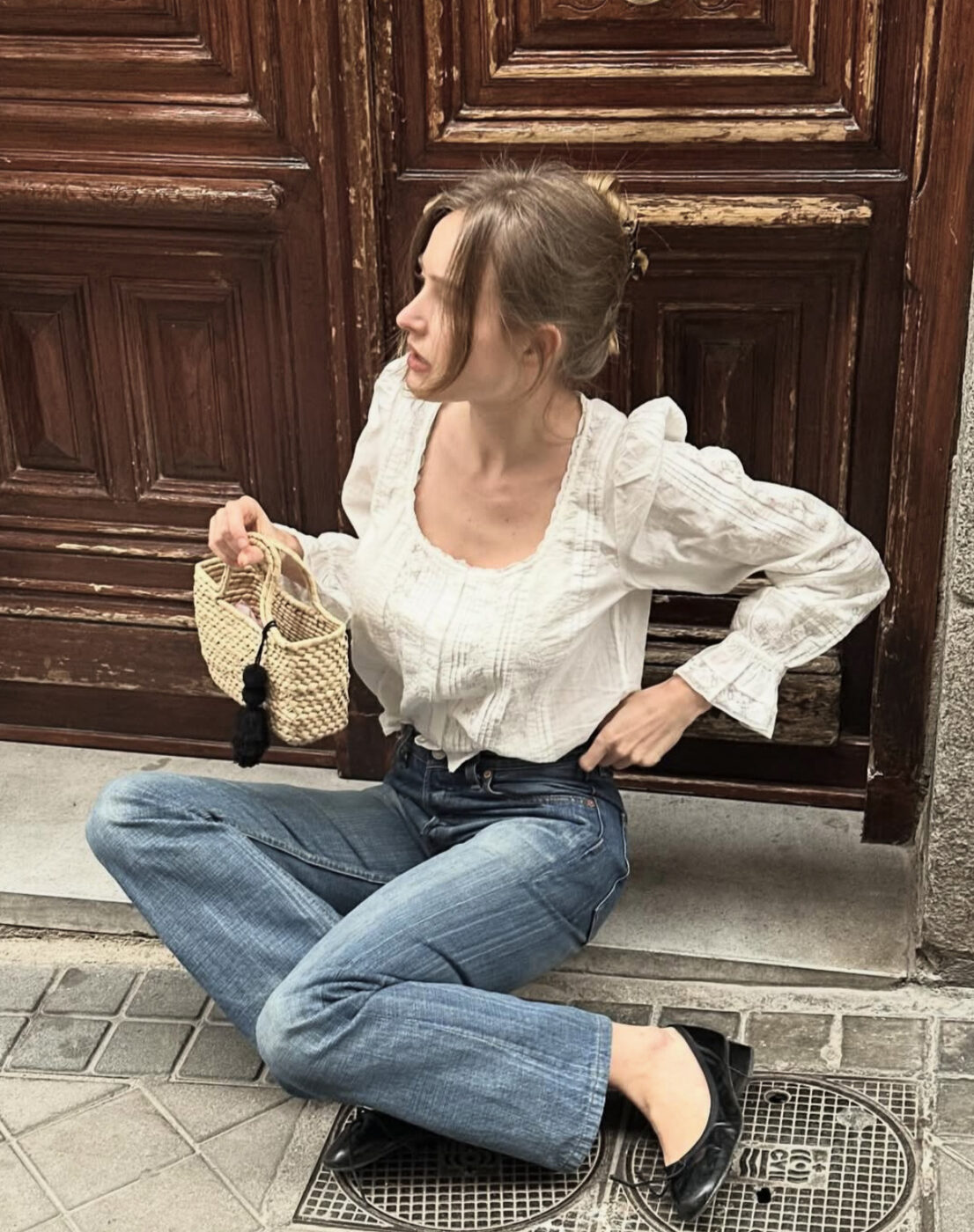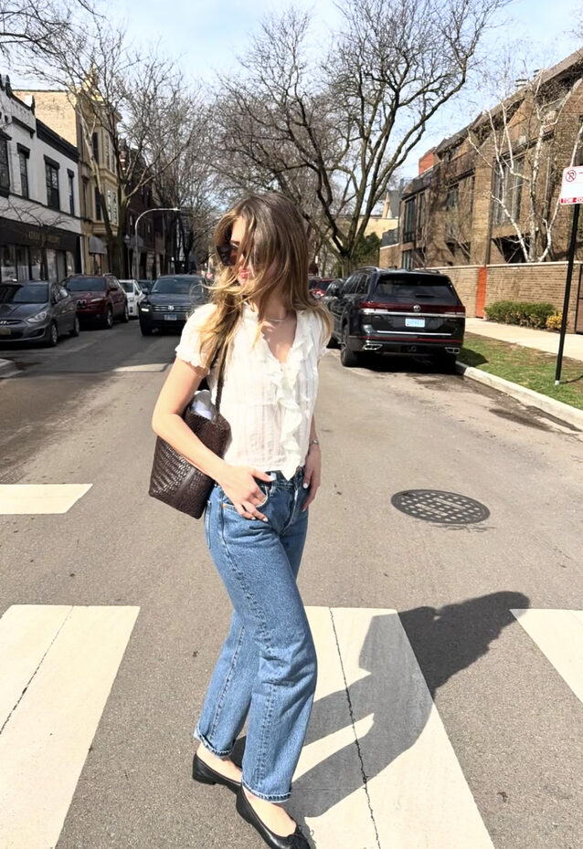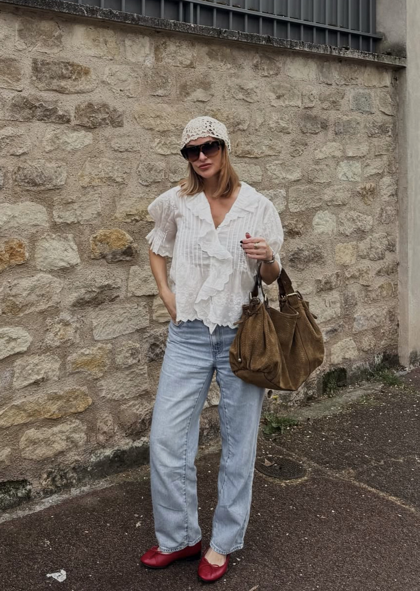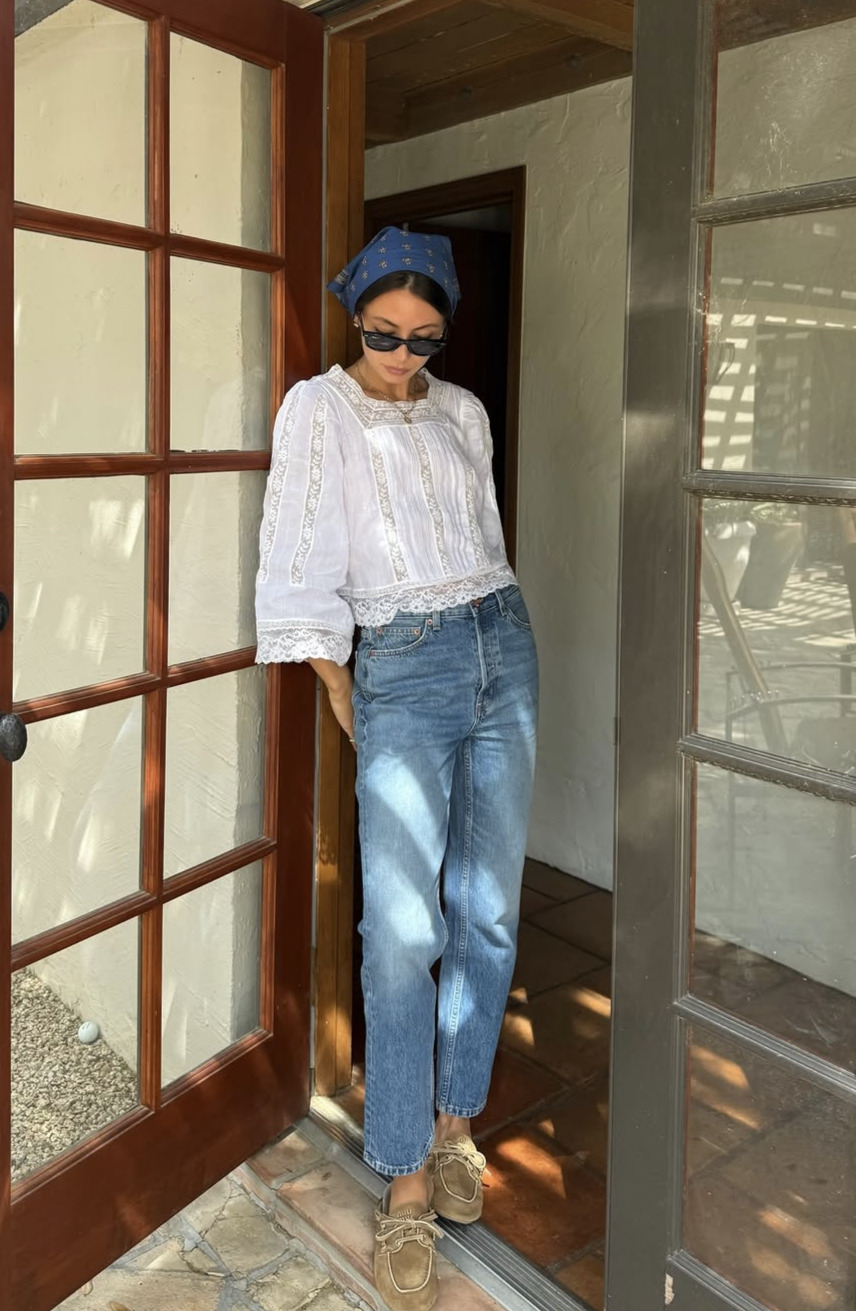 스트레이트 진과 화이트 코티지 블라우스의 매칭 또한 시선을 사로잡습니다. 슬림한 바지 라인에 섬세하고 로맨틱한 디테일의 블라우스가 일상에서 입기 좋은 적당한 감도를 완성하죠. 여기에 발레리나 슈즈를 신는다면 가장 이상적인 조합을 이룹니다. 빈티지와 클래식함을 고루 갖추었어요.