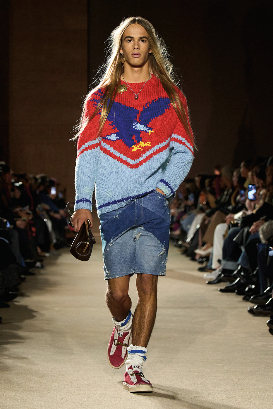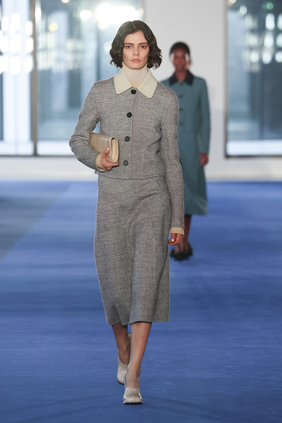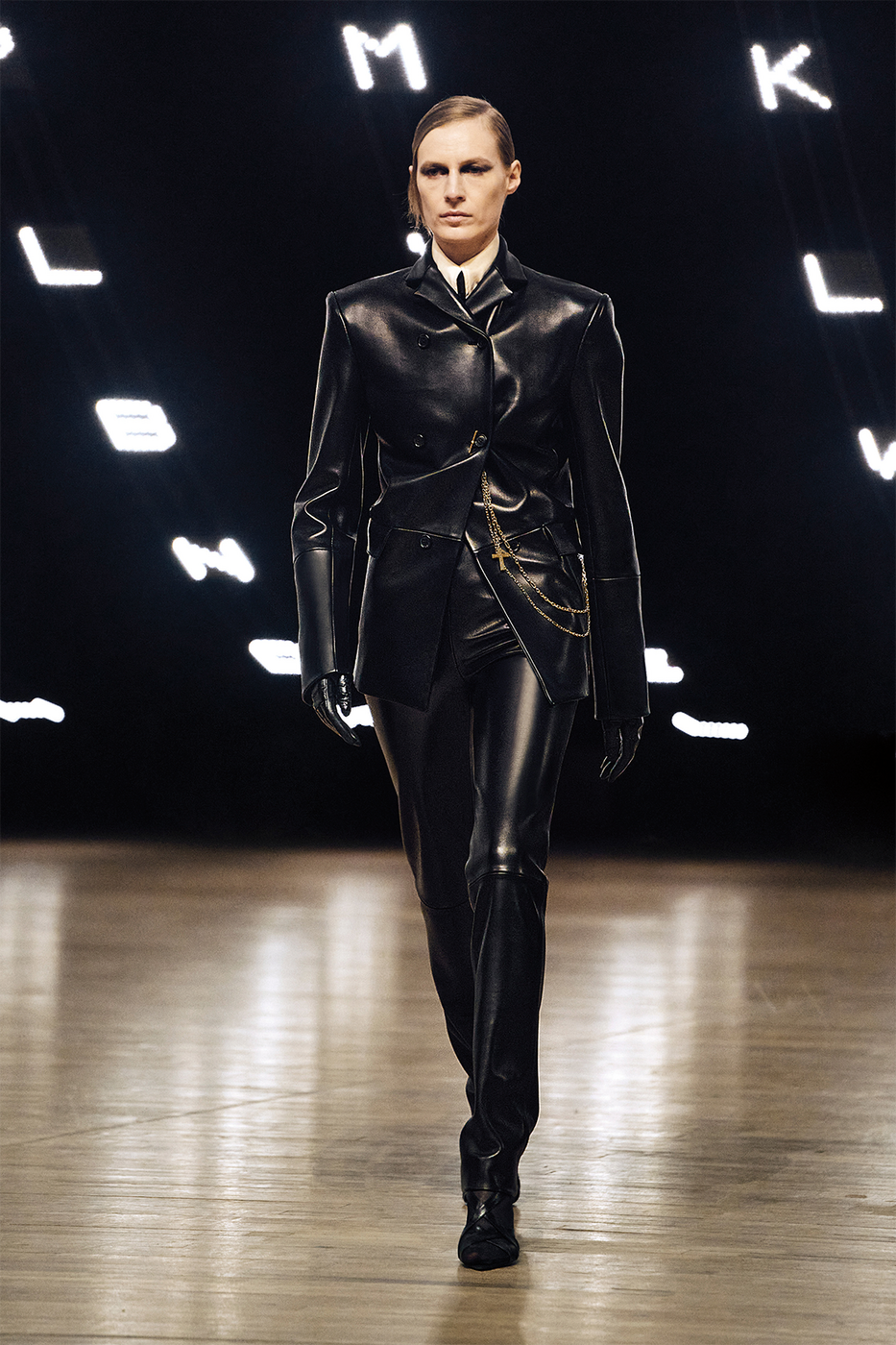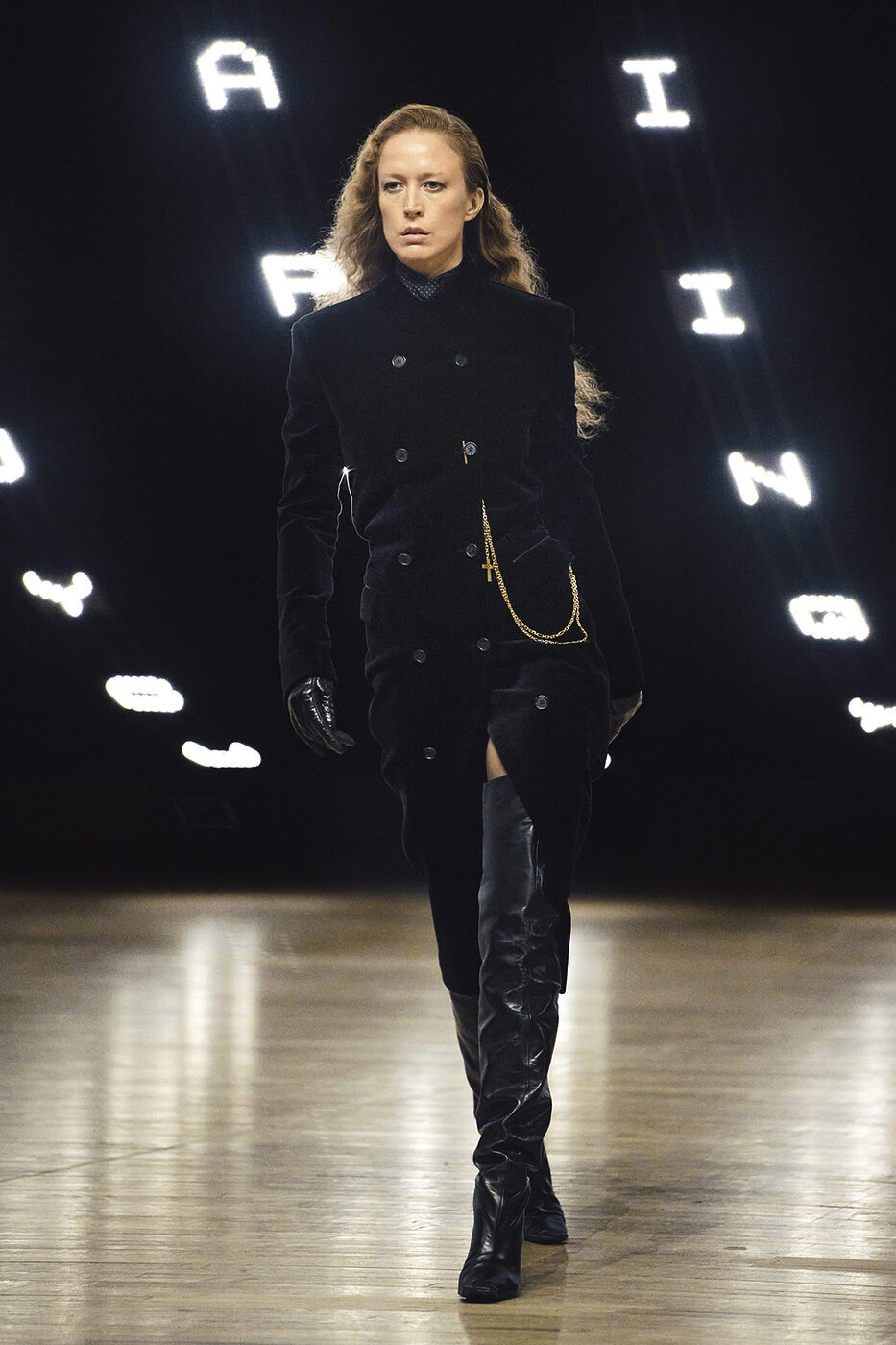 1,500평 규모의 공간에 설치된 거대한 LED 월과 여백의 미를 살린 황동색 스툴의 배치. 파크 애비뉴 아모리의 번쩍이는 문자들이 연출한 극적인 배경 속에서, 이번 시즌 케이트 크리에이티브 디렉터 캐서린 홀스타인의 영감이 무척 궁금해졌다. ‘단어의 짓눌리는 무게(The crushing weight of words)’와 같은 문구들이 쏟아지는 런웨이는 곧장 레터박스 앱을 켜 오손 웰스 감독의 다큐멘터리 <거짓의 F(F for Fake)>를 워치 리스트에 추가하게 만들었다.