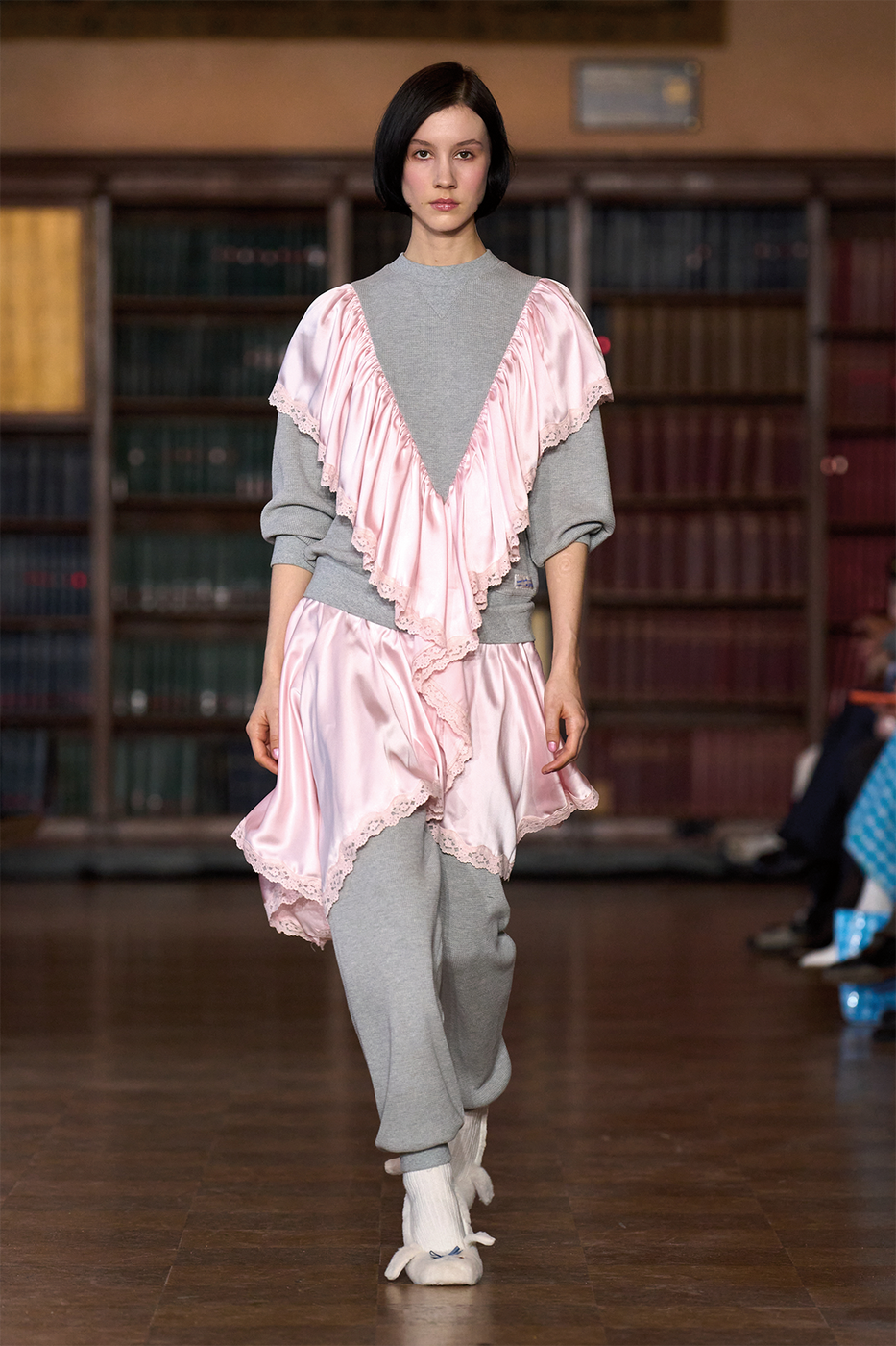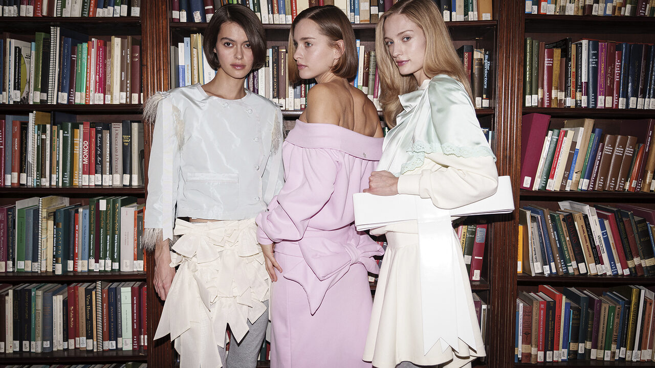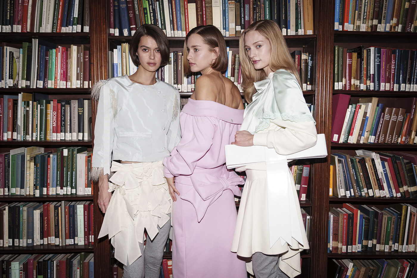 마침내, 뉴욕 패션위크의 마지막 날. 급하게 잡아탄 택시에 몸을 싣고 샌디 리앙 쇼로 향하던 중 창밖의 낯선 풍경을 마주했다. 순간의 당혹도 잠시, 장소 선정에 대한 디자이너의 자신감을 느끼며 쇼 베뉴는 어떨지 기대감을 키웠다. 엘리베이터를 타고 올라간 고층 건물에는 고전적 분위기의 책들로 가득 찬 서가가 게스트를 맞이했고, 쇼가 시작되자 이내 어린 시절의 향수를 자극하는 장면들로 자연스레 이어졌다. 침대 위에서의 티타임, 애니메이션 속 따스한 기억들이 겹겹이 포개지며 뉴욕 의학 아카데미 도서관을 파자마 파티가 열리는 소녀들의 궁전으로 탈바꿈시켰다.