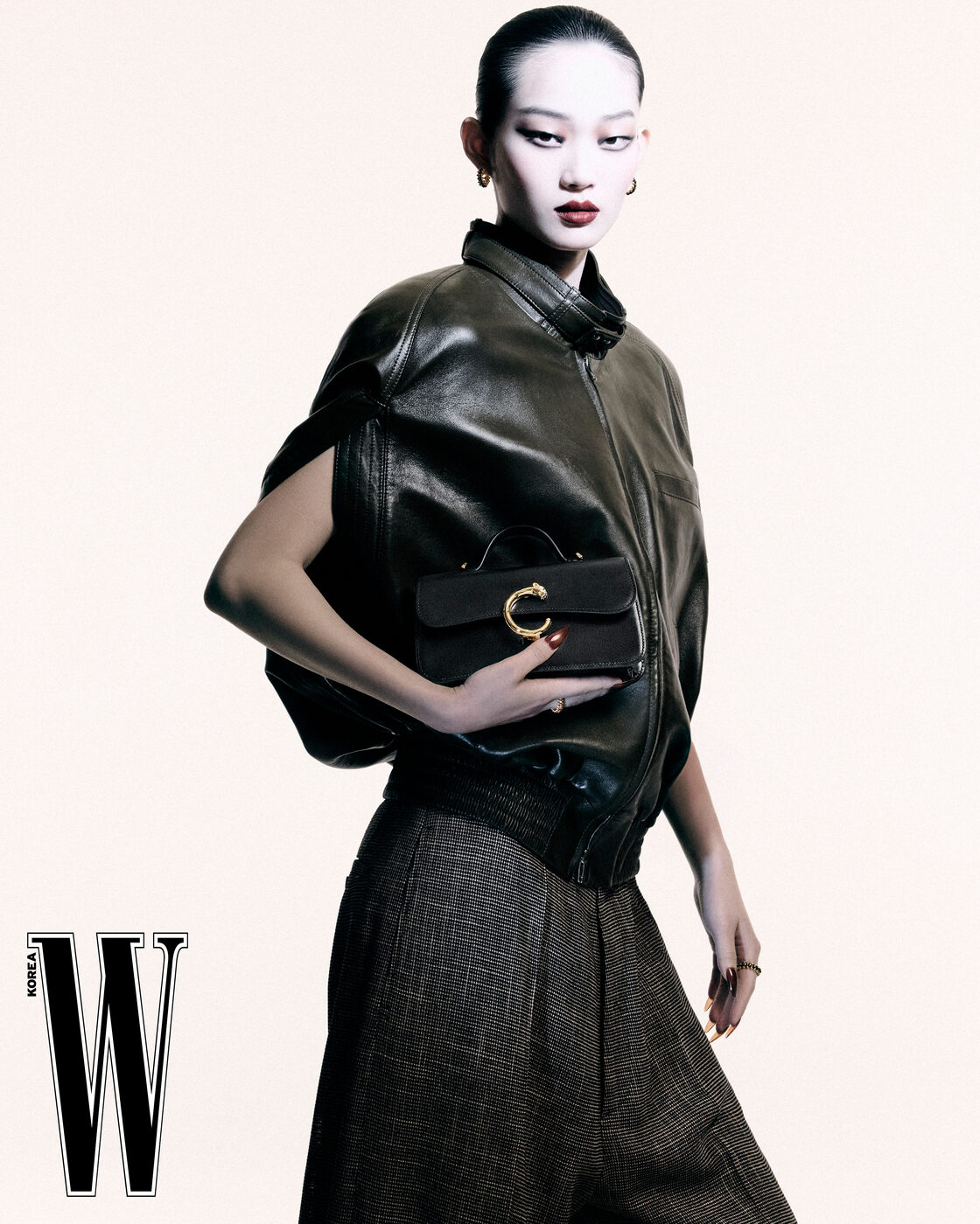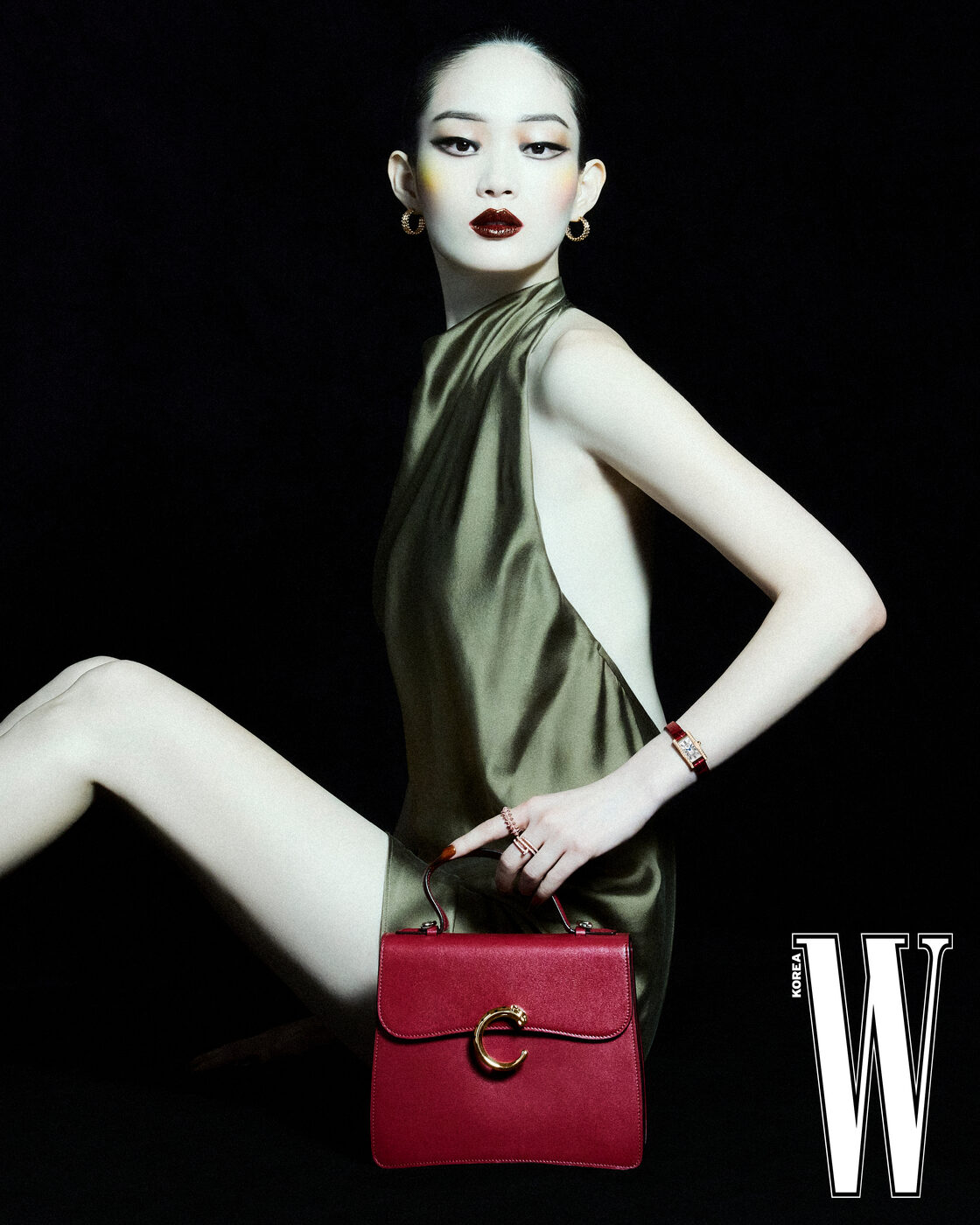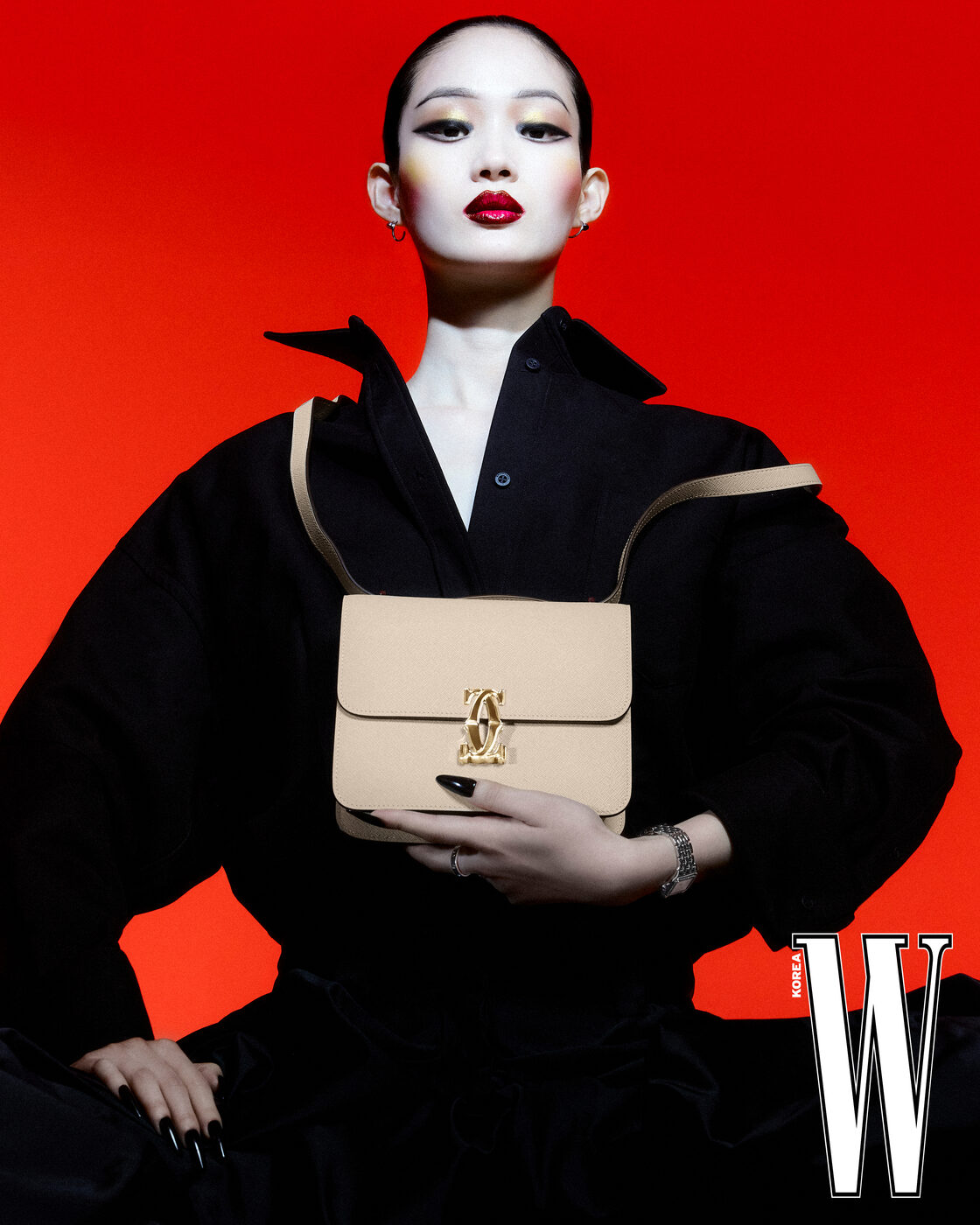 체리 레드 그레인 카프스킨에 골드 피니싱 잠금장치를 더한 팬더 C 드 까르띠에 핸들백 스몰 모델, 핑크 골드 클래쉬 드 까르띠에 이어링, 핑크 골드 케이스에 다이아몬드를 세팅한 탱크 아메리칸 워치, 검지에 낀 핑크 골드 클래쉬 드 까르띠에 링, 중지에 낀 핑크 골드에 다이아몬드를 세미 파베 세팅한 저스트 앵 끌루 링은 Cartier 제품.