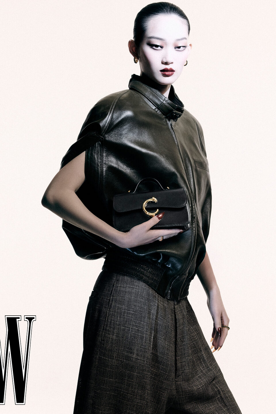 검정 그레인 카프스킨에 검정 에나멜 및 골드 피니싱 잠금장치를 더한 팬더 C 드 까르띠에 핸들 백 나노 모델, 핑크 골드에 오닉스를 세팅한 클래쉬 드 까르띠에 이어링, 오른손 중지에 낀 핑크 골드에 오닉스를 세팅한 클래쉬 드 까르띠에 링, 왼손 검지에 낀 핑크 골드의 클래쉬 드 까르띠에 링은 Cartier 제품.