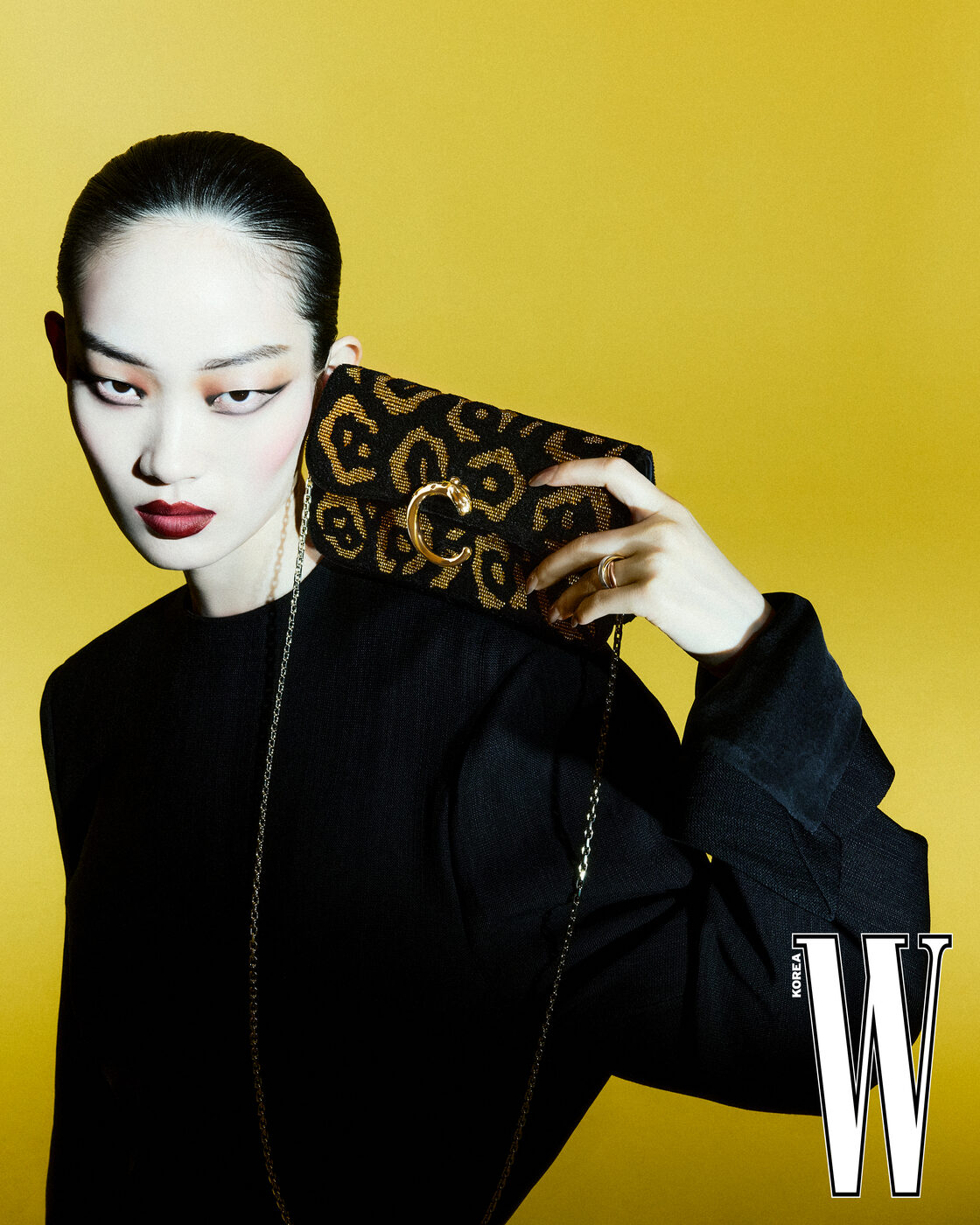 블랙 터프팅 및 골드 비즈, 레오파드 모티프의 팬더 C 드 까르띠에 체인 백 미니 모델, 화이트 골드, 옐로 골드, 핑크 골드 소재의 트리니티 링은 Cartier 제품.
