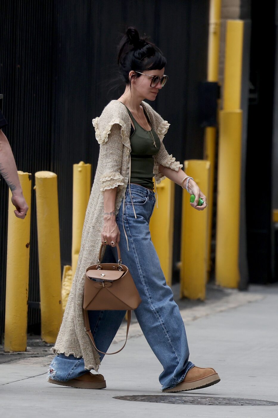 러플 장식이 트리밍된 베이지 컬러의 아우터는 발목까지 내려올 정도로 길지만 오히려 이 조합으로 더 크고 날씬해 보이는 효과를 주었죠. 이 스타일링이 더욱 편안해 보이는 이유는 두꺼운 힐의 투박한 어그 슈즈도 한 몫 했습니다. 여기에 클래식한 브라운 토트 백을 들고 빈티지한 프레임의 선글라스 착용한 40세의 릴리 앨런이 모습은 여유롭고 세련됨 그 자체입니다.